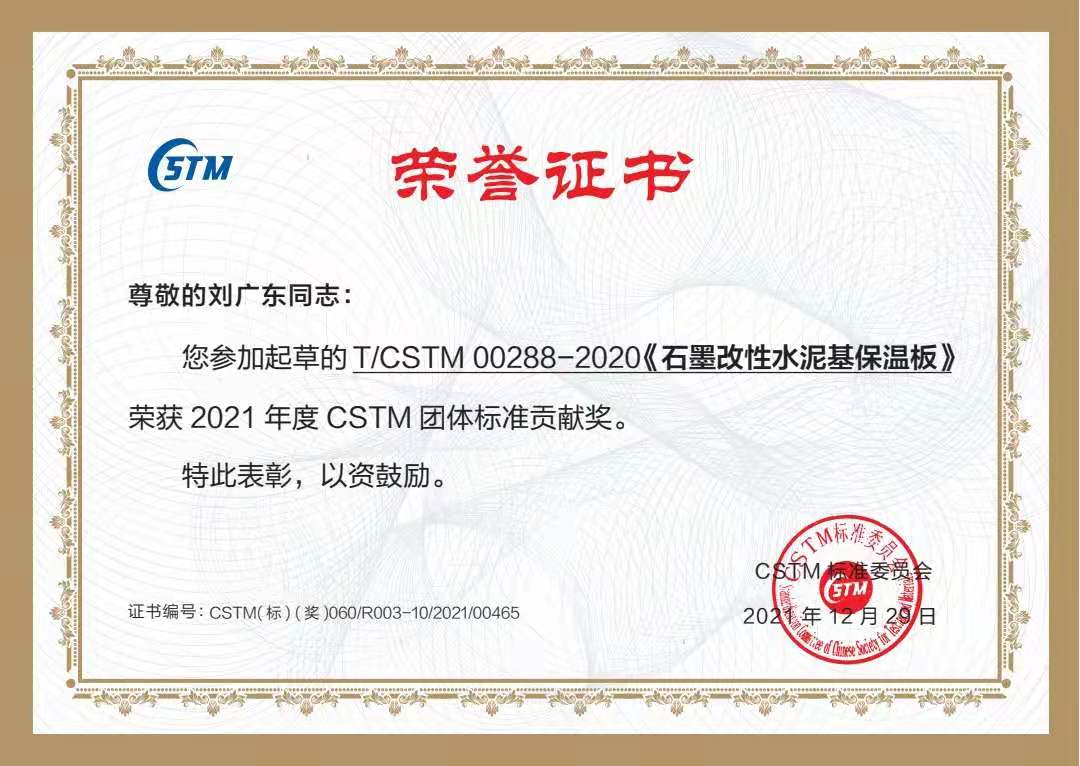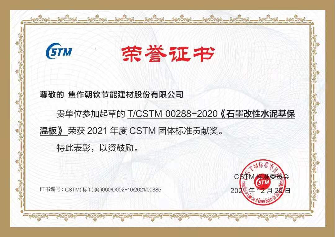 2022年1月13日,焦作朝欽節(jié)能建材股份有限公司收到來自CSTM委員會(huì)頒發(fā)的我公司參加起草的“T/CSTM00288-2020《石墨改性水泥基保溫板》榮獲2021年度CSTM團(tuán)體標(biāo)準(zhǔn)貢獻(xiàn)獎(jiǎng)”。